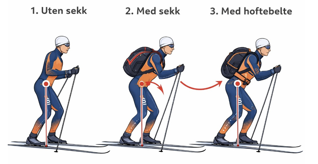 Den kompenserer ved å lene seg mer fremover. Dette er dokumentert i utallige biomekaniske studier (4). Rent praktisk vil dette påvirke din langrennsteknikk både du som staker og du som går med festevoks. Hvis sekken sitter høyt og langt bak, vil du bli mer fremoverlent enn nødvendig. Det kan påvirke både diagonalgang og stakingen , mao det er ikke ubetydelig hvordan sekken plasseres eller hvordan du fordeler vekten om ditt mål er å ha minst forandring på din arbeidsøkonomi når du tar på deg sekken.